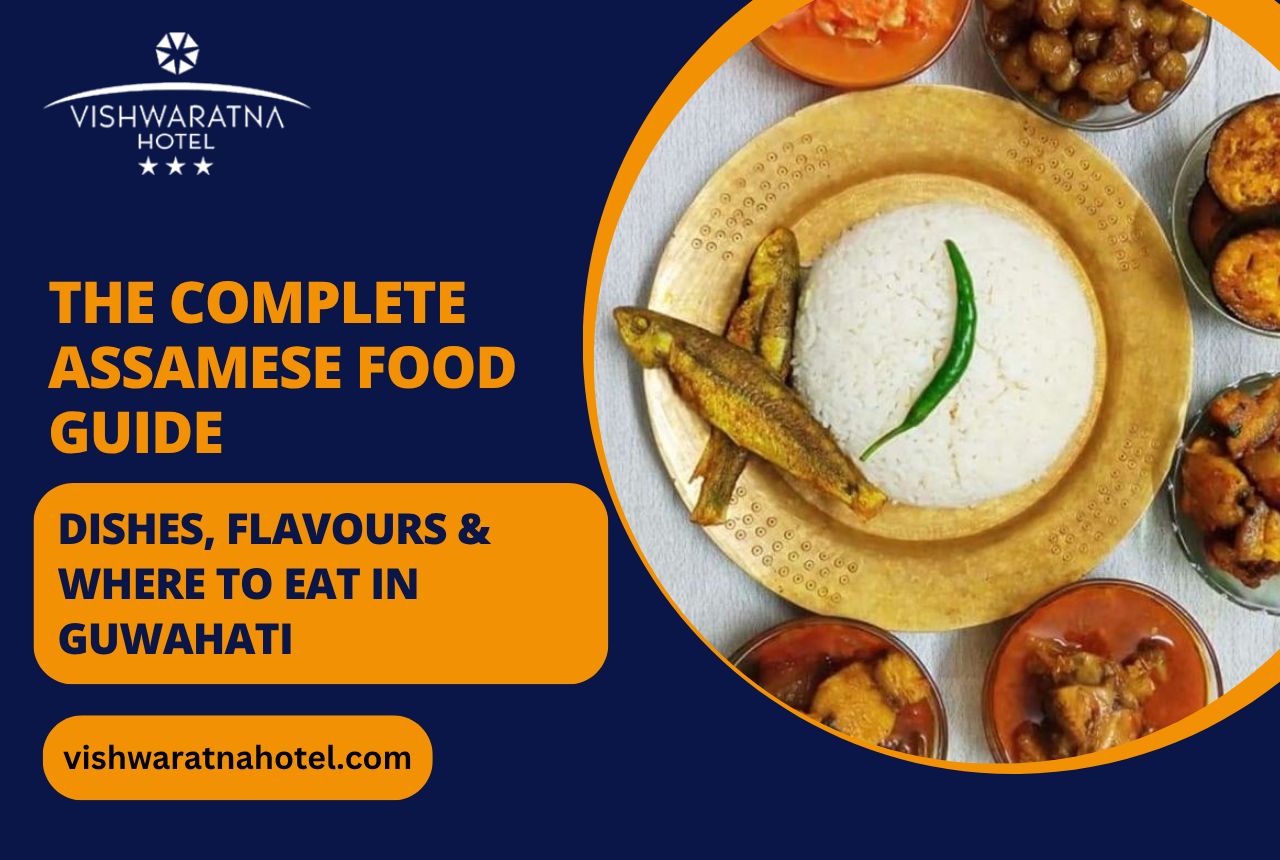 A: Authentic Assamese food is found in local dhabas in Paltan Bazaar and Fancy Bazar, at morning food stalls for traditional Jolpaan breakfast, and at hotels that specifically curate Assamese cuisine. Vishwa Ratna Hotel in Guwahati offers a curated Assamese menu featuring fresh river fish, traditional khar preparations, and festival-season specials, using locally sourced ingredients.